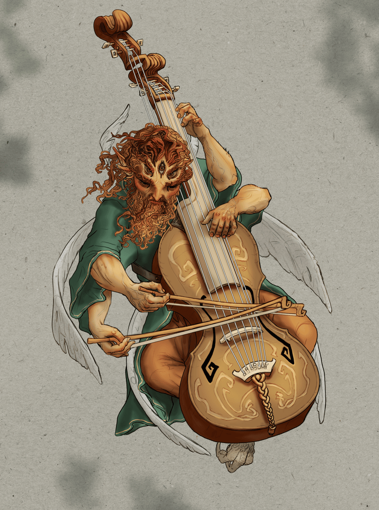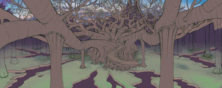 For Critique: Only a small portion of this piece is complete, but any general impressions of the piece, comments on style, feedback on colors, and feedback on composition would be helpful! Initial interpretations of the world-building aspects of this piece would be very informative for me to hear as well. Critiques focused on the top right image would be most helpful!