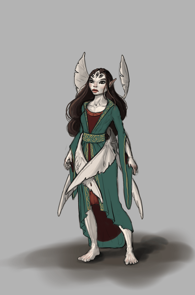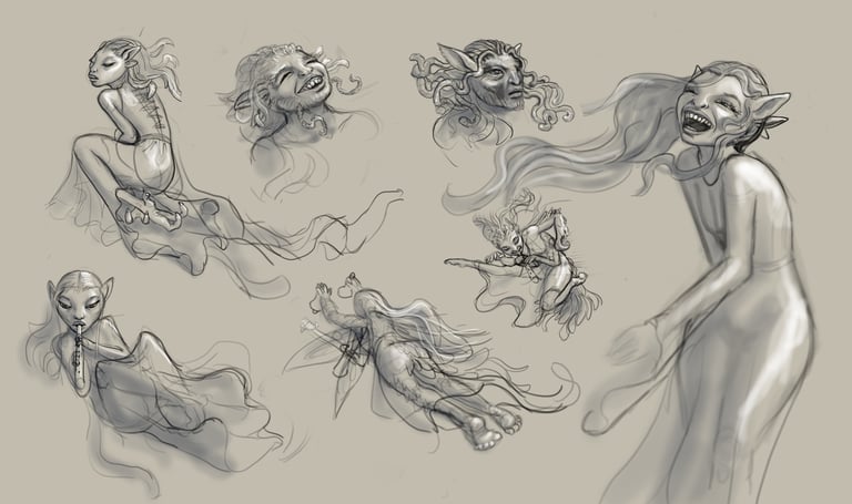 Bottom Center: Fairy sketch showing intended clothing style