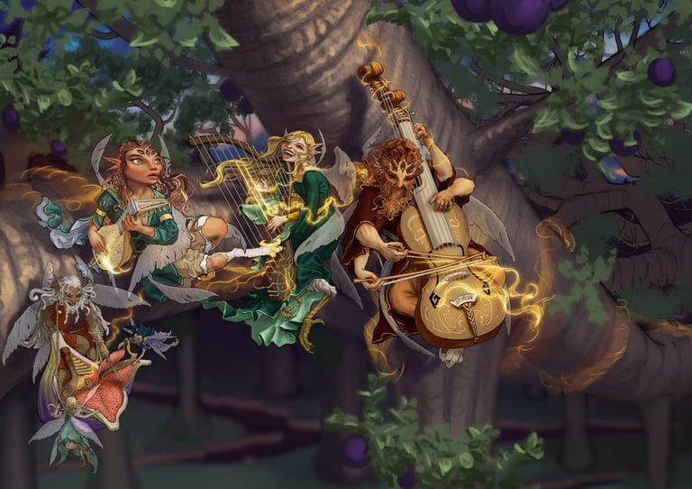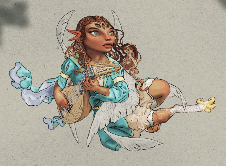 Bottom 3 images: Individual fairy details - line work and colors are final, shading and detailed texturing are incomplete